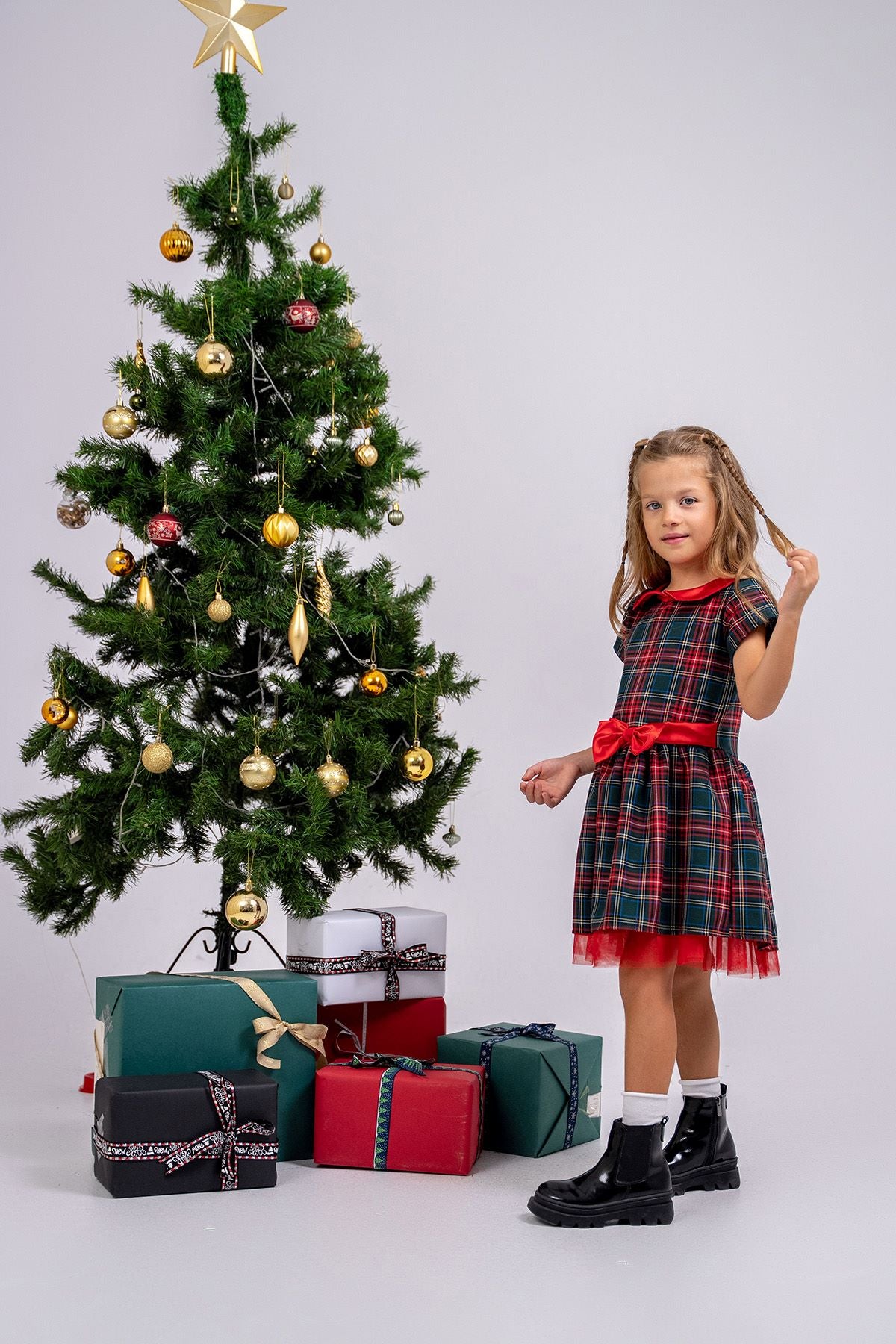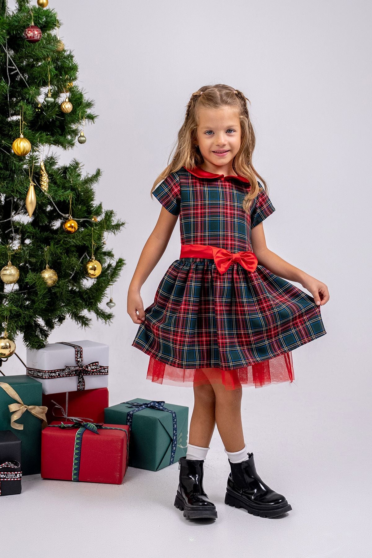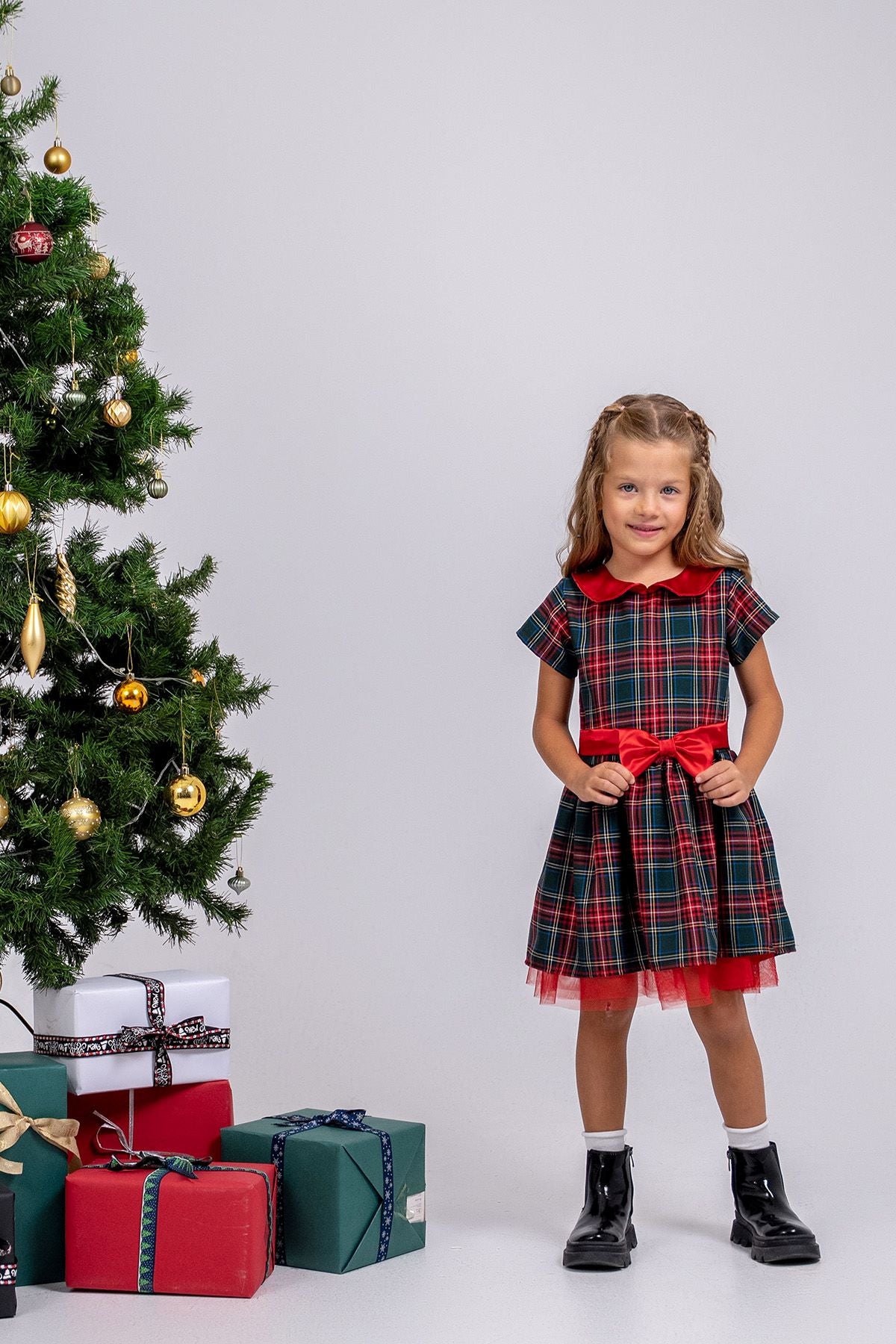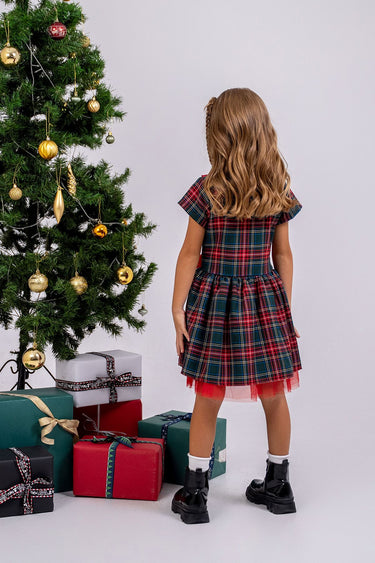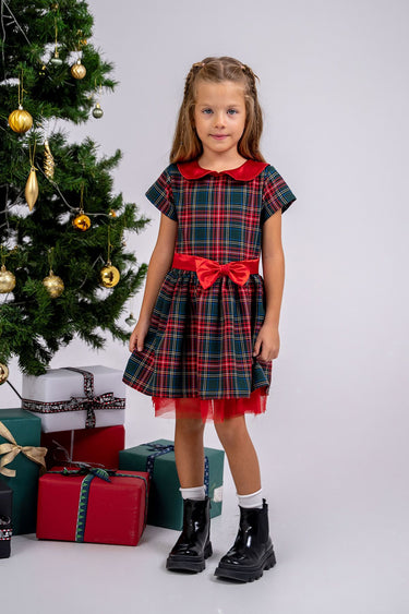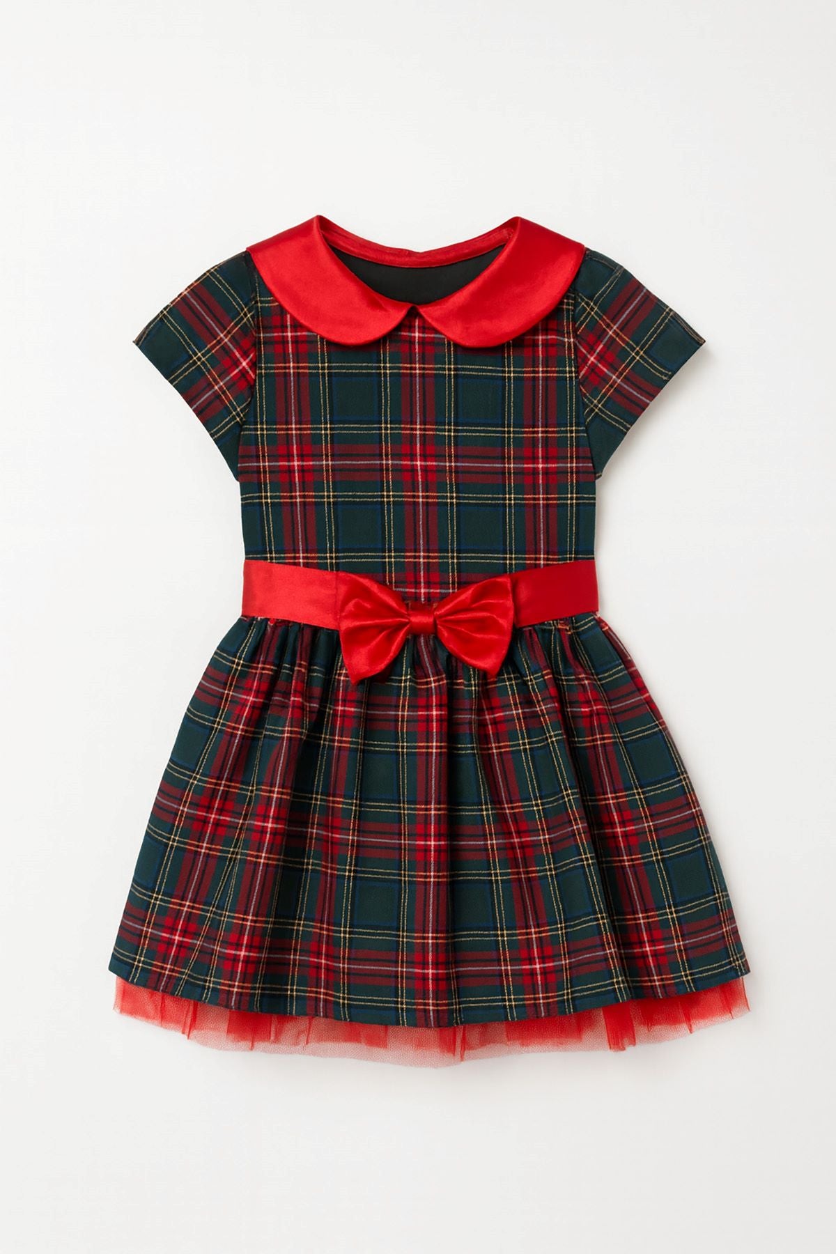 Kız Çocuk Ekose Desenli Fiyonklu Tüllü ( 2-6 ) Yaş Elbise