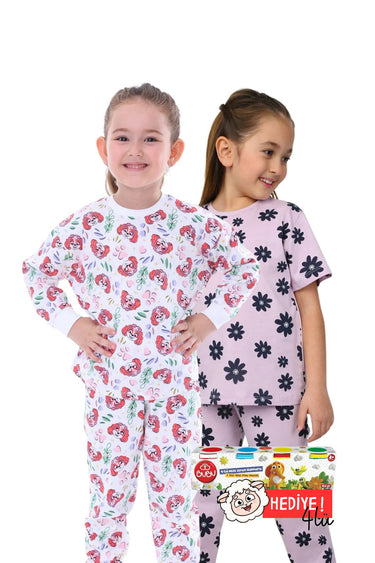 2'Lİ RENKLİ KELEBEK VE PEMBE KALP DESENLİ KIZ ÇOCUK PİJAMA TAKIMI